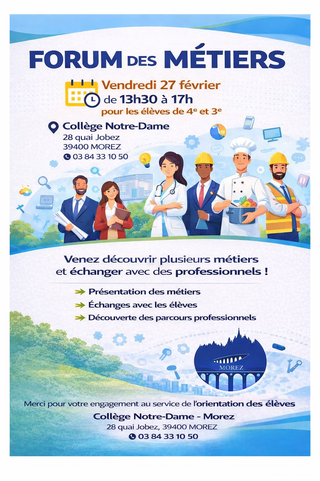 Dans le cadre de l’accompagnement à l’orientation des élèves, le Collège Notre-Dame de Morez organise un Forum des métiers le vendredi 27 février, de 13h30 à 17h, au sein de l’établissement. Cet événement est destiné aux élèves de 4e et de 3e, afin de les aider à mieux comprendre le monde professionnel et à construire progressivement leur projet d’orientation.